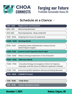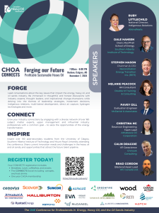Join us at CHOA CONNECTS as we forge, connect and inspire the future of the Canadian energy, heavy oil and oil sands industry. Together with experienced executives and industry professionals, supportive sponsors and partners, and our team of motivated volunteers and staff we will power up to further positive change, foster meaningful collaborations, and drive innovation for a sustainable and profitable energy future.
